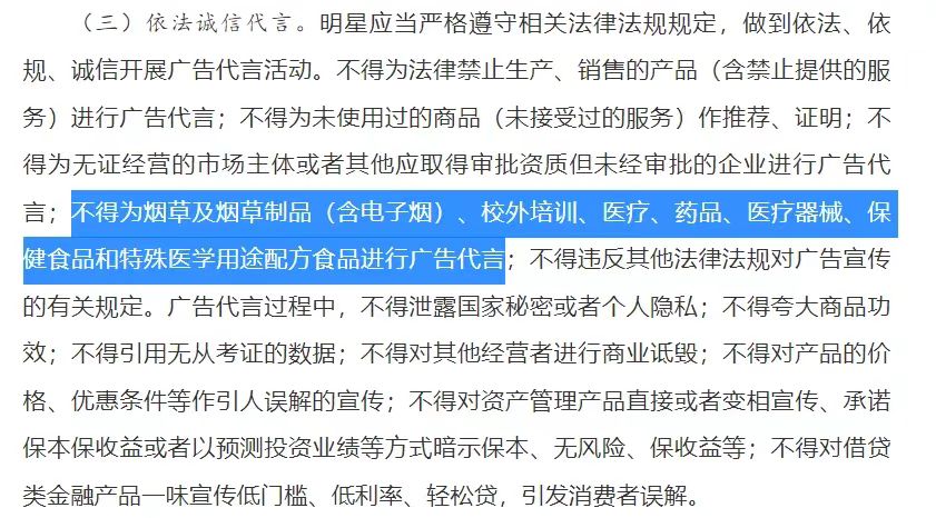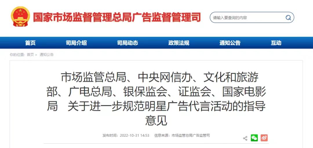 今年10月31日多部門聯(lián)合發(fā)布的《關(guān)于進(jìn)一步規(guī)范明星廣告代言活動(dòng)的指導(dǎo)意見》