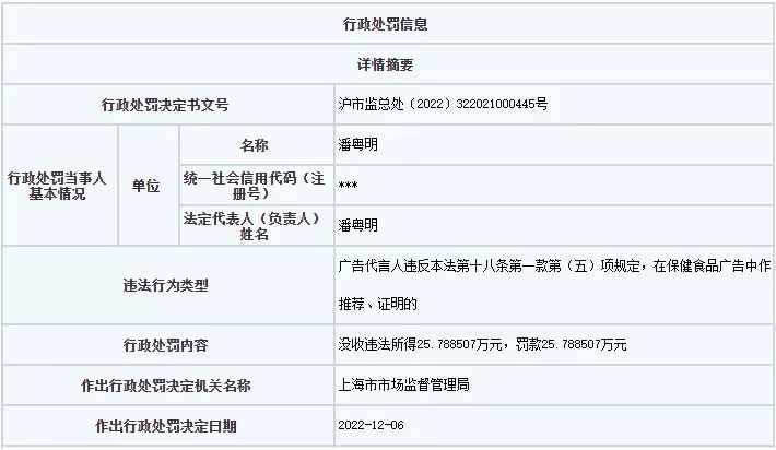 影視演員潘粵明因違法代言廣告行為,被市場(chǎng)監(jiān)管部門罰款25.7萬(wàn)余元。上海市市場(chǎng)監(jiān)管局近期公開的行政處罰信息顯示,今年12月6日,上海市市場(chǎng)監(jiān)管局作出了這一行政處罰決定。