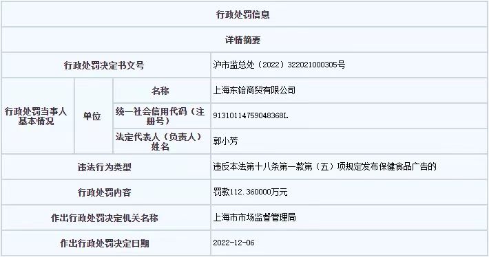 對(duì)上海東鉿商貿(mào)有限公司,上海市市場(chǎng)監(jiān)管局于12月6日作出責(zé)令當(dāng)事人停止發(fā)布違法廣告、在相應(yīng)范圍內(nèi)消除影響,并處以廣告費(fèi)用一倍的罰款(112.36萬(wàn)元)的行政處罰決定。