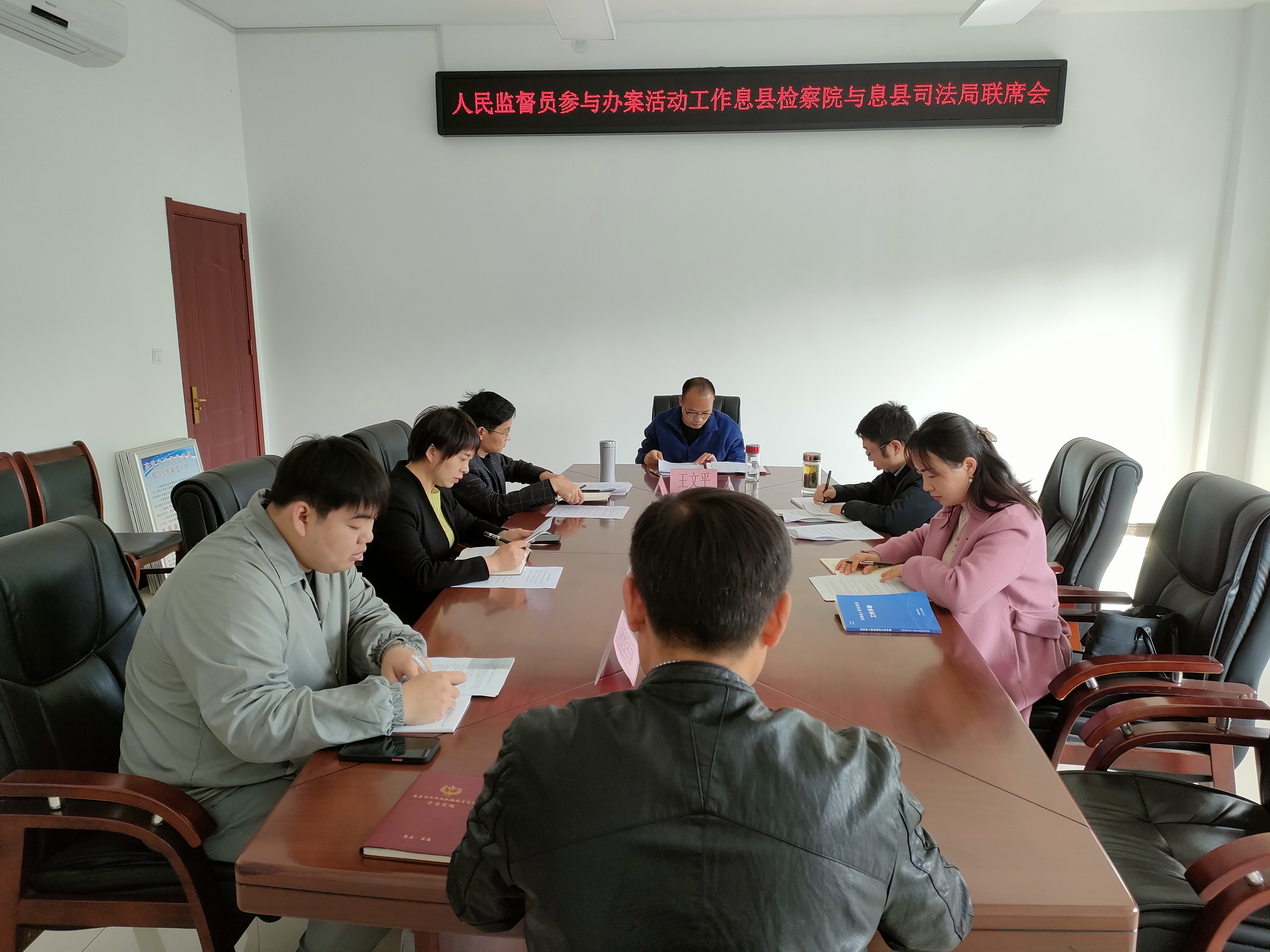 為進(jìn)一步規(guī)范人民監(jiān)督員工作,增強(qiáng)人民監(jiān)督員履職能力和提高人民監(jiān)督員辦案活動(dòng)參與度。3月28日,息縣組織召開了人民監(jiān)督員參與辦案活動(dòng)工作息縣檢察院與息縣司法局聯(lián)席會(huì)??h司法局黨組成員、副局長尹猛、縣人民檢察院副檢察長楊勇,及轄區(qū)3位人民監(jiān)督員參加會(huì)議,會(huì)議由尹猛主持。