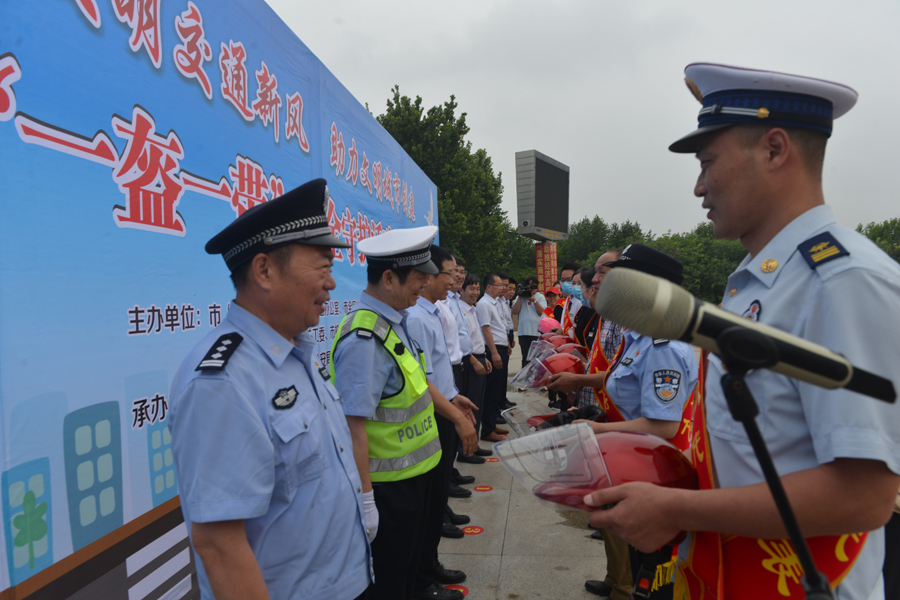 為進(jìn)一步提升摩托車、電動自行車騎乘人員和汽車駕乘人員安全防護(hù)水平,有效減少交通事故傷害,倡導(dǎo)文明交通新風(fēng),助力文明城市創(chuàng)建,2020年6月12日上午,鶴壁市在新世紀(jì)廣場隆重舉行“一盔一帶”安全守護(hù)活動啟動儀式。市政府副秘書長熊發(fā)祿,市總工會黨組書記魏永生,市公安局交通管理支隊支隊長李樹良,市、區(qū)文明單位創(chuàng)建辦主任,公安交警、志愿者、鶴壁好人、勞動模范、群眾代表、媒體記者共500多人參加儀式。儀式由市公安局黨委委員、副局長衛(wèi)萬鋒主持。