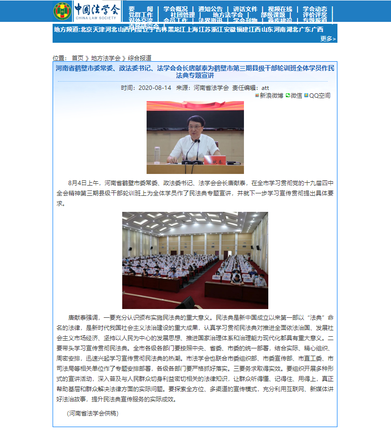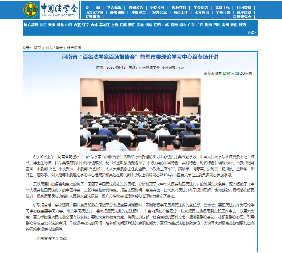 近日,中國(guó)法學(xué)會(huì)發(fā)布兩則鶴壁市法學(xué)會(huì)工作動(dòng)態(tài),對(duì)我市民法典宣講活動(dòng)和“雙百”活動(dòng)開展給予肯定,并將鶴壁市的經(jīng)驗(yàn)做法進(jìn)行推廣。