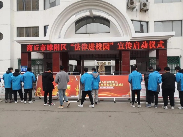 為進(jìn)一步加深青少年學(xué)生對(duì)憲法知識(shí)的了解,引導(dǎo)青少年樹(shù)立憲法觀念,促進(jìn)法治校園、平安校園建設(shè),商丘市睢陽(yáng)區(qū)法學(xué)會(huì)在憲法宣傳周期間,積極組織開(kāi)展豐富多彩的法治宣傳進(jìn)校園活動(dòng),12月8日,商丘市睢陽(yáng)區(qū)法學(xué)會(huì)組織力量在睢陽(yáng)區(qū)第四高中舉行了以“弘揚(yáng)憲法精神,建設(shè)法治校園”為主題的宣傳教育活動(dòng)。在校園內(nèi)擺放憲法宣傳版面,用圖文并茂的形式,向全校師生向全體師生宣講憲法知識(shí)和憲法精神的重要意義,通過(guò)多媒體播放、領(lǐng)讀憲法、憲法宣誓等形式,教育引導(dǎo)全體師生努力學(xué)習(xí)憲法,讓?xiě)椃?quán)威、憲法至上理念根植于孩子們內(nèi)心,教育孩子們學(xué)會(huì)尊崇法治、敬畏法律、了解法律、學(xué)習(xí)法律、運(yùn)用法律,努力為依法治校營(yíng)造良好的法治氛圍。