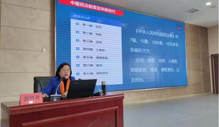 郭德香教授從民法典的劃時代意義、法治功能、制度創(chuàng)新和實施等四個方面對民法典做了全面闡述。民法典是新中國成立以來第一部以“法典”命名的法律,是新時代我國社會主義法治建設(shè)的重大成果,在中國特色社會主義法律體系中具有重要地位,是一部固根本、穩(wěn)預(yù)期、利長遠(yuǎn)的基礎(chǔ)性法律。民法典將于2021年1月1日起實施,很多條文直面社會發(fā)展和人民生活的熱點難點問題,如何依據(jù)最新法律法規(guī)開展工作,服務(wù)群眾,是每一名公務(wù)員必須要學(xué)習(xí)的重要內(nèi)容。