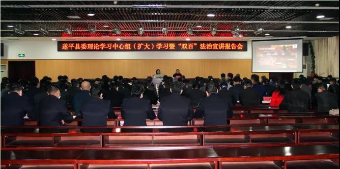 10月22日,遂平縣委理論學(xué)習(xí)中心組召開(擴大)學(xué)習(xí)暨“雙百”法治宣講報告會。遂平縣四個班子領(lǐng)導(dǎo)和縣處級領(lǐng)導(dǎo)出席報告會。各鄉(xiāng)鎮(zhèn)(街道、管委會)黨(工)委書記、政法委員;縣委各部委常務(wù)副職、縣直各單位主要負(fù)責(zé)人參加報告會。