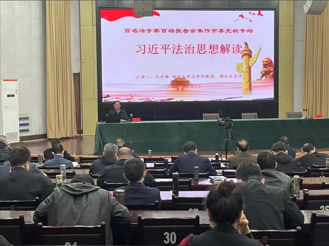 11月1日,焦作市法學會聯(lián)合市委組織部、市委黨校舉辦2021年“百名法學家百場報告會”焦作市委黨校專場法治宣講活動。鄭州大學法學院教授、博士生導師沈開舉,應邀做了題為“習近平法治思想解讀”的報告。焦作市委黨校習近平新時代中國特色社會主義思想縣處級干部研修班、縣處級公務員進修班、鄉(xiāng)科級干部研修班、鄉(xiāng)科級公務員進修班、中青年干部培訓班,共200余名學員聆聽了報告。