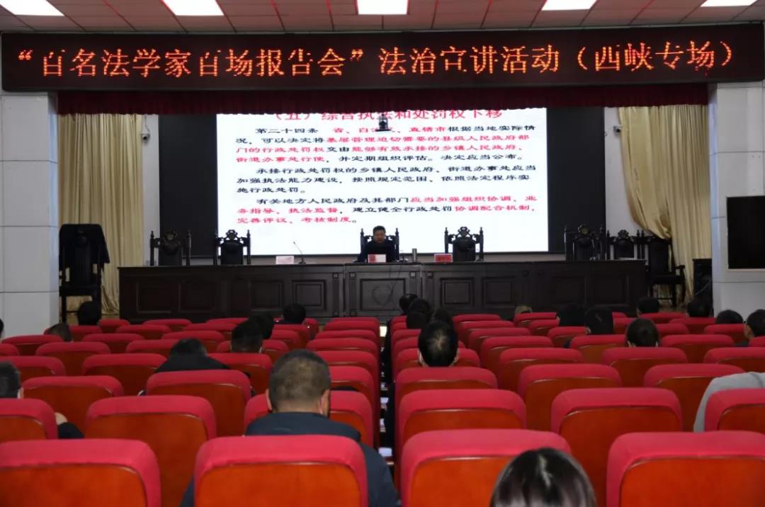 為進(jìn)一步提高領(lǐng)導(dǎo)干部理論修養(yǎng)和法治素養(yǎng),不斷增強(qiáng)領(lǐng)導(dǎo)干部運(yùn)用法治思維和法治方式處理問(wèn)題的能力,推進(jìn)法治政府建設(shè)。12月15日下午,西峽縣舉辦“百名法學(xué)家百場(chǎng)報(bào)告會(huì)”法治宣講活動(dòng),邀請(qǐng)河南財(cái)經(jīng)政法大學(xué)教授楊合理作《行政處罰法》專題輔導(dǎo)報(bào)告。西峽縣副縣長(zhǎng)、公安局長(zhǎng)冀守興,縣法院黨組書(shū)記、院長(zhǎng)肖新征,縣司法局黨組書(shū)記、局長(zhǎng)喬琰出席宣講活動(dòng),副縣長(zhǎng)、公安局長(zhǎng)冀守興主持,縣直各行政執(zhí)法單位分管法治工作領(lǐng)導(dǎo)和法制室主任以及部分單位新申領(lǐng)行政執(zhí)法證件人員聆聽(tīng)了報(bào)告。