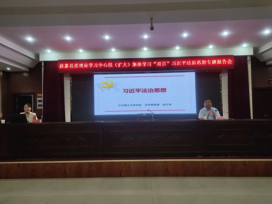 8月26日,獲嘉縣舉辦縣委中心組(擴(kuò)大)集體學(xué)習(xí)暨“雙百”習(xí)近平法治思想宣講報(bào)告會(huì),邀請(qǐng)新鄉(xiāng)市委黨校法學(xué)教研部主任,副教授趙紅艷進(jìn)行宣講,報(bào)告會(huì)由縣委常委、政法委書(shū)記李學(xué)良主持。