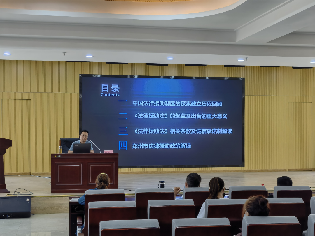 培訓(xùn)邀請鄭州市法律援助中心副主任做專業(yè)講授,從法律援助制度的立法意義、申請事項(xiàng)范圍、申請法律援助的經(jīng)濟(jì)困難標(biāo)準(zhǔn)及誠信承諾制等方面進(jìn)行了詳細(xì)的解讀,重申法律援助法頒布實(shí)施的重大意義及具體適用范圍,引導(dǎo)法律援助志愿律師、法律援助志愿者進(jìn)一步提升法律服務(wù)意識和水平,切實(shí)為需要法律援助的群眾提供高質(zhì)量的法律援助服務(wù)。