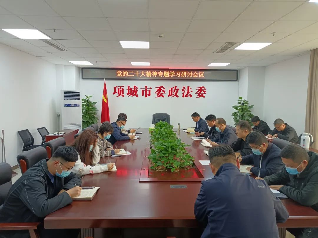 近日,項城市委政法委、市法學會召開黨的二十大精神專題學習研討會議,市委政法委領導班子成員、委機關全體黨員干部和部分法學會會員參加會議。