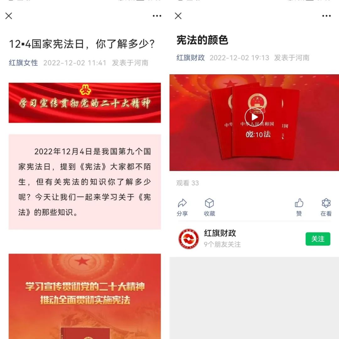 因當前疫情形勢嚴峻,新鄉(xiāng)市紅旗區(qū)深耕線上普法宣傳。紅旗區(qū)各機關(guān)單位、各律師事務所等充分利用官方微信公眾號、微博、抖音等新媒體平臺,持續(xù)發(fā)布憲法相關(guān)知識,充分發(fā)揮線上宣傳的優(yōu)勢,真正讓憲法走進群眾心里。新鄉(xiāng)市紅旗區(qū)法學會會同區(qū)司法局在“法治紅旗”微信公眾號開設“憲法宣傳月”專欄,發(fā)布學習貫徹黨的二十大精神以及憲法宣傳相關(guān)文章,推動憲法學習宣傳常態(tài)化。另外,還利用轄區(qū)主干道沿街門店電子顯示屏、機關(guān)辦公樓電子顯示屏滾動播放憲法宣傳口號標語、憲法宣傳視頻,讓廣大群眾進一步感受憲法、了解憲法,增強法律意識,提高法律素養(yǎng),在全社會營造了學法、懂法、用法、守法的良好氛圍。