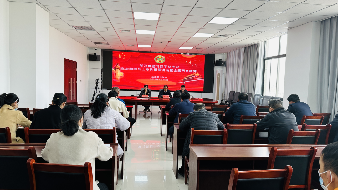 3月15日,延津縣法學會召開會議,學習貫徹習近平總書記在全國兩會上系列重要講話和全國兩會精神??h委政法委副書記、縣法學會副會長鄭艷艷主持會議。