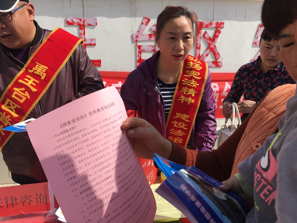 4月15日是黨的十九大后第一個全民國家安全教育日,為深入學(xué)習(xí)宣傳新憲法,弘揚新憲法精神,開拓新時代國家安全工作新局面,結(jié)合加強國家安全法等相關(guān)法律知識宣傳普及,提升全民國家安全意識要求,禹王臺區(qū)普治辦、法學(xué)會聯(lián)合組織全區(qū)各成員單位根據(jù)自身實際開展了形式多樣、豐富多彩的全民國家安全教育日法治宣傳活動。區(qū)住建局、區(qū)環(huán)衛(wèi)局、區(qū)城管局、新門關(guān)辦事處、三里堡辦事處、官坊辦事處、菜市辦事處等30余個成員單位走上大街、火車站廣場、社區(qū)進行宣傳,機場派出所、繁塔派出所、紅洋樓派出所組織干警到午朝門廣場進行宣傳。區(qū)工商分局、國稅分局、繁塔辦事處等10余個單位組織全體干部及工作人員收看相關(guān)的紀錄片、宣傳片。