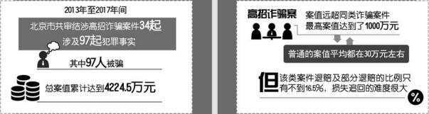 據(jù)法官介紹,北京的高招詐騙案案值遠(yuǎn)超同類詐騙案件,最高案值達(dá)到了1000萬元,普通的案值平均都在30萬元左右。但該類案件退賠及部分退賠的比例只有不到16.5%,損失追回的難度很大。這些高招詐騙分子學(xué)歷相對較高,研究生、大學(xué)本科及??茖W(xué)歷有30人,受高等教育比率達(dá)到47.6%。