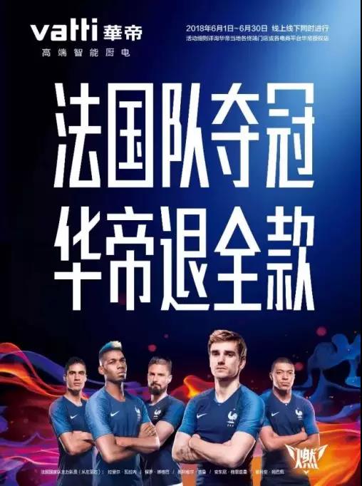 2018年5月31日,華帝推出的“法國隊奪冠華帝退全款”就火遍朋友圈:在2018年5月30日,華帝發(fā)布公告,如果法國隊在本次世界杯中奪冠,華帝將對購買“奪冠套餐”的消費者進行退全款。