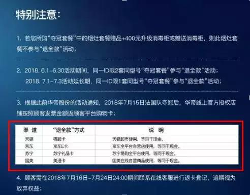 小編發(fā)現,在天貓旗艦店上,“法國隊奪冠,華帝退全款“的活動細則上表示,退全款金額是“等額的天貓超市卡”,在京東、蘇寧易購、國美網站有關“華帝退全款”的活動細則上都表明退全款金額是“京東E卡”、“蘇寧禮品卡”、“美通卡”,即不會退現金。