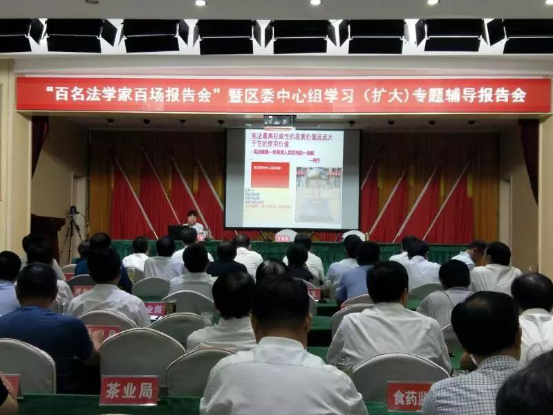 8月14日,信陽市浉河區(qū)舉辦“百名法學家百場報告會”暨區(qū)委中心組學習(擴大)專題輔導報告會,報告會由信陽市浉河區(qū)區(qū)長于海忠主持,區(qū)委副書記梁玉峰、區(qū)委政法委書記宋昊、區(qū)委宣傳部部長杜娟等區(qū)委中心組成員(在職副處級以上領(lǐng)導)與會聽取輔導報告,區(qū)委辦分管副主任,區(qū)人大、區(qū)政府辦公室主任,區(qū)政協(xié)秘書長,區(qū)委各部委辦主要負責同志,鄉(xiāng)鎮(zhèn)辦事處黨政正職1人,區(qū)直單位主要負責人,區(qū)法學會成員單位代表等近160人到會。