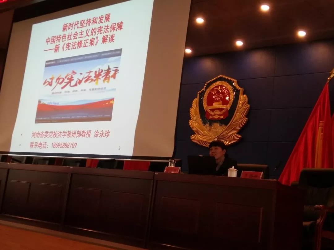 11月17日,濮陽(yáng)市范縣法學(xué)會(huì)、縣依法治縣辦在范縣公安局報(bào)告廳,組織“雙百”宣講進(jìn)縣委理論學(xué)習(xí)中心組(擴(kuò)大)憲法學(xué)習(xí)報(bào)告會(huì),邀請(qǐng)河南省委黨校法學(xué)教授涂永珍進(jìn)行憲法宣講。