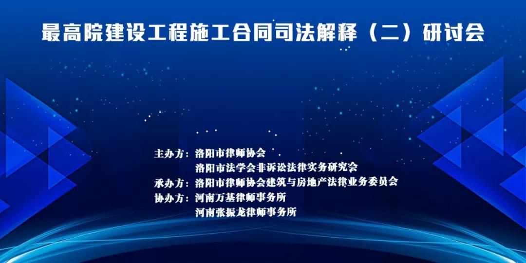 2019年1月18日,由洛陽(yáng)市律師協(xié)會(huì)、洛陽(yáng)市法學(xué)會(huì)非訴訟法律實(shí)務(wù)研究會(huì)主辦,洛陽(yáng)市律師協(xié)會(huì)建筑與房地產(chǎn)法律業(yè)務(wù)委員會(huì)承辦,河南萬(wàn)基律師事務(wù)所、河南張振龍律師事務(wù)所協(xié)辦的《最高人民法院關(guān)于審理建設(shè)工程施工合同糾紛案件適用法律若干問(wèn)題的解釋?zhuān)ǘ费杏憰?huì)在洛陽(yáng)舉行。