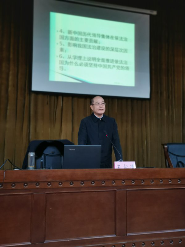 25日下午,王新清教授圍繞“全面推進(jìn)依法治國(guó)的思想和實(shí)踐”課題,從①習(xí)近平依法治國(guó)新理念新思想新戰(zhàn)略的核心內(nèi)容;②習(xí)近平依法治國(guó)新理念新思想新戰(zhàn)略的學(xué)理基礎(chǔ);③法治和道德建設(shè)具有共同的邏輯起點(diǎn);④新中國(guó)歷代領(lǐng)導(dǎo)集體在依法治國(guó)方面的主要貢獻(xiàn);⑤影響我國(guó)法治建設(shè)的深層次因素;⑥從學(xué)理上說(shuō)明全面推進(jìn)依法治國(guó)為什么必須堅(jiān)持中國(guó)共產(chǎn)黨的領(lǐng)導(dǎo)6個(gè)方面。談古論今、由內(nèi)及外,給我縣黨委理論學(xué)習(xí)中心組和全縣領(lǐng)導(dǎo)干部作了一次精彩的法治專題報(bào)告,對(duì)我縣領(lǐng)導(dǎo)干部提高政治站位、深化思想認(rèn)識(shí)、增強(qiáng)法治思維具有很強(qiáng)的指導(dǎo)意義。