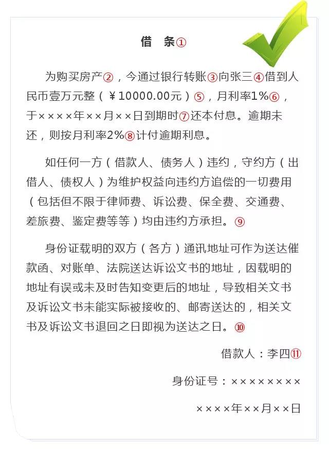 同時,最好讓借款人將簽名捺印的身份證復(fù)印件作為借條的附件,或?qū)⑸矸葑C復(fù)印到借條背面或其他空白位置。