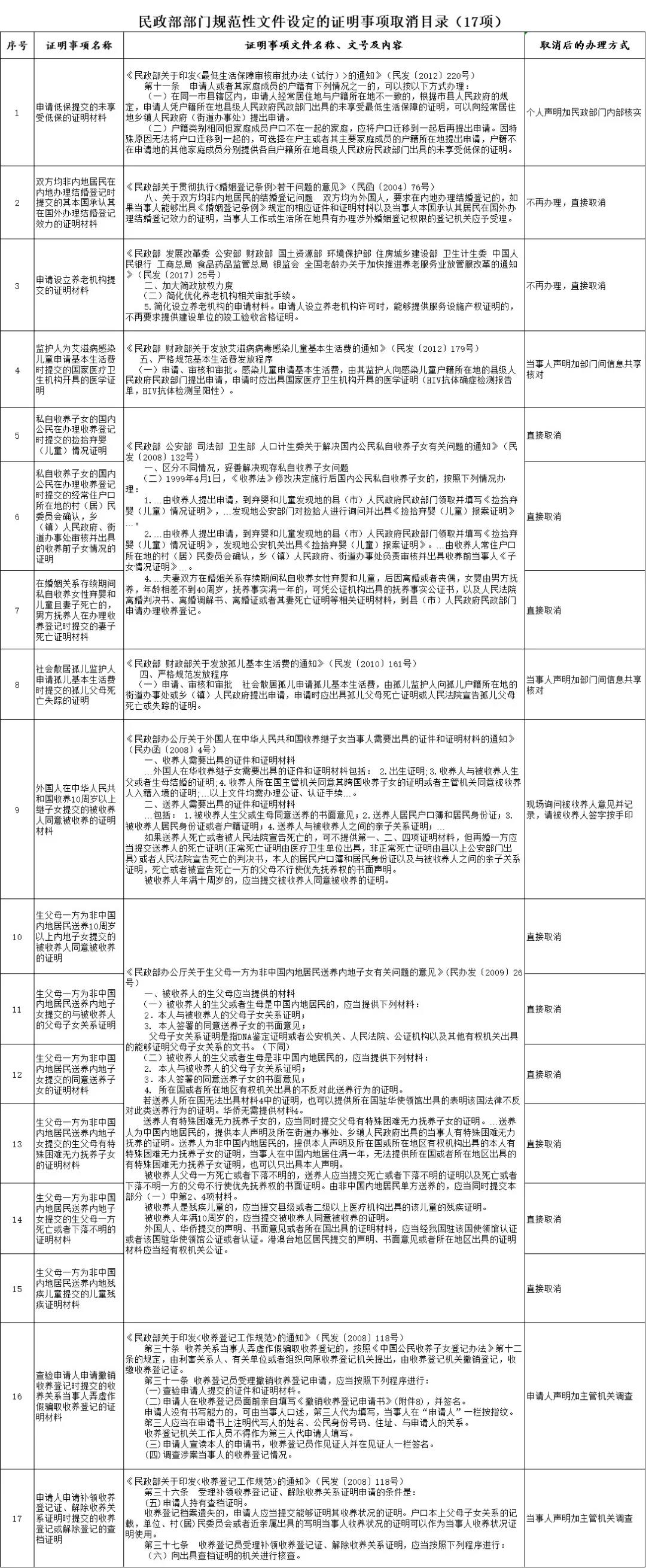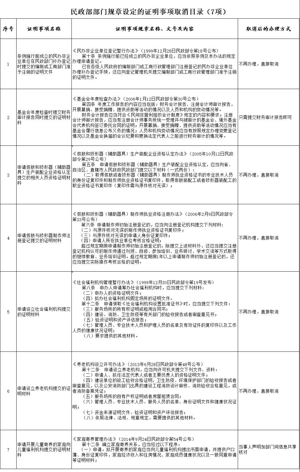 為貫徹落實(shí)黨中央、國務(wù)院關(guān)于減證便民、優(yōu)化服務(wù)的決策部署,根據(jù)《國務(wù)院辦公廳關(guān)于做好證明事項(xiàng)清理工作的通知》(國辦發(fā)〔2018〕47號)要求,近日,民政部印發(fā)《關(guān)于取消24個證明事項(xiàng)的公告》。將民政部取消的24個證明事項(xiàng)予以公布,自公告之日起停止執(zhí)行。證明事項(xiàng)涉及的部門規(guī)章和規(guī)范性文件按程序修改后另行公布。