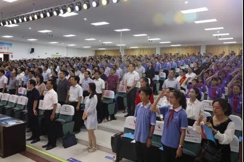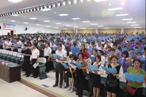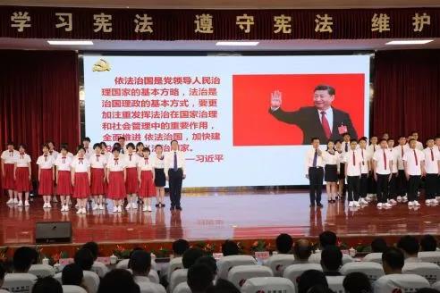 河南省教育廳副巡視員王學(xué)進(jìn)宣布河南省第四屆學(xué)生“學(xué)憲法講憲法”活動正式啟動。啟動儀式上,全體人員奏唱國歌,全體師生一起唱響憲法歌曲——《憲法伴我們成長》。