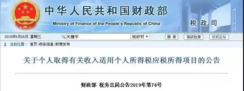 近日,財政部、稅務總局聯(lián)合印發(fā)《關于個人取得有關收入適用個人所得稅應稅所得項目的公告》(財政部稅務總局公告2019年第74號,以下簡稱《公告》),現(xiàn)就有關問題解答如下: