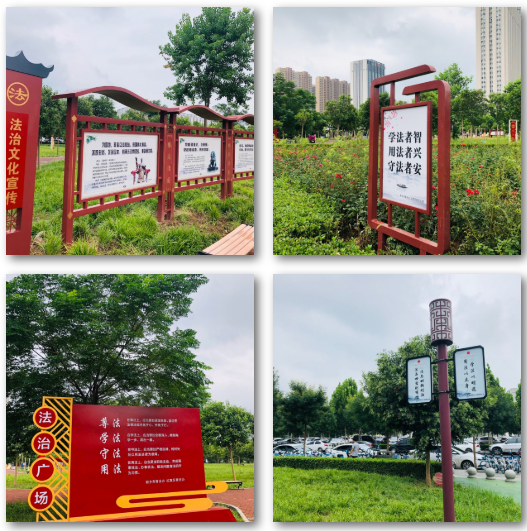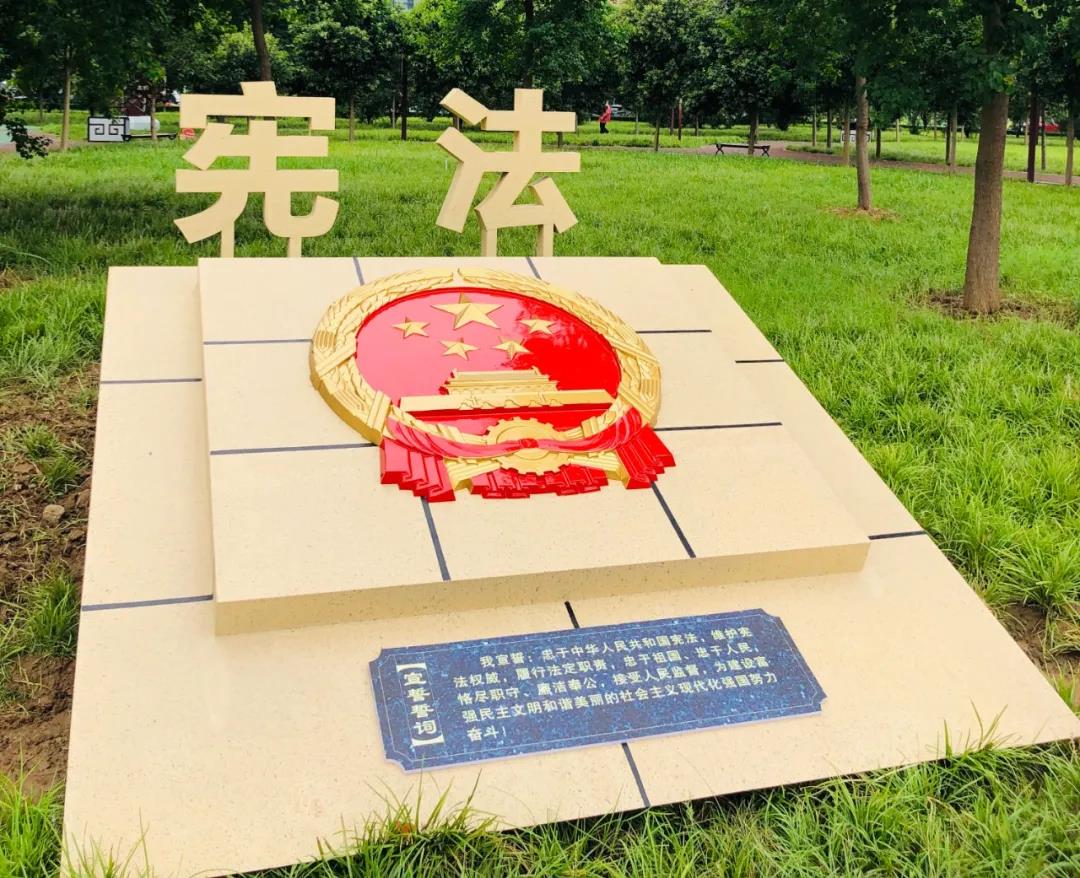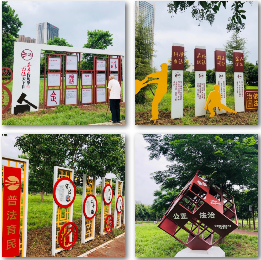 該廣場借助原有的燈桿、小路、長凳、健身庭等載體,通過富有美感的中國風(fēng)石刻、宣傳欄、魔方雕塑等藝術(shù)形式,展示了“法治諺語”“法”字演變“法治故事”“憲法宣誓誓詞”“社會主義核心價值觀”等十多個與群眾息息相關(guān)的法律法規(guī)系列作品,以簡潔、古樸、寓意深刻的方式傳播法治理念,賦予公園新的文化生命力,讓轄區(qū)居民在閑暇休憩、鍛煉的同時潛移默化地接受法治教育,提升法治文化地標(biāo)對社會的法治輿論引導(dǎo)力。