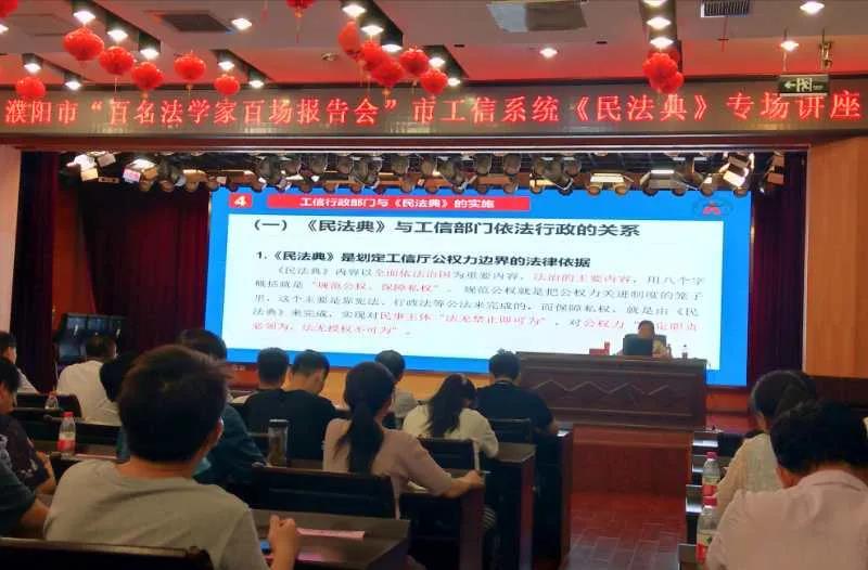 8月25日下午,由濮陽市工信局主辦、中國郵政濮陽分公司承辦的濮陽市“百名法學家百場報告會”濮陽市工信系統(tǒng)民法典專場講座開講。省雙百活動民法典宣講團團員、省法學會自貿(mào)區(qū)法治研究中心副主任、鄭州大學法學院教授、博士生導師郭德香應邀做專題講座。市工信局副局長張龍海主持,市工信系統(tǒng)各單位分管領(lǐng)導、科(室)長共100余人參加。