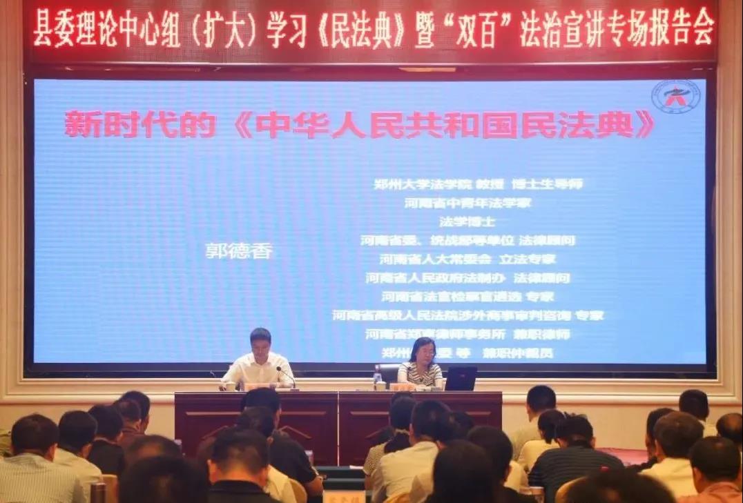 為深入學(xué)習(xí)宣傳貫徹民法典,開展社會(huì)主義法治理念教育,弘揚(yáng)法治精神,加強(qiáng)黨的執(zhí)政能力建設(shè),推進(jìn)平安西平與法治西平建設(shè),進(jìn)一步提高廣大黨員和領(lǐng)導(dǎo)干部依法執(zhí)政、依法行政的能力和水平。9月11日下午,西平縣委理論學(xué)習(xí)中心組(擴(kuò)大)民法典學(xué)習(xí)會(huì)議暨西平縣“雙百”法治宣講專場(chǎng)報(bào)告會(huì)舉行??h委副書記管保臣主持報(bào)告會(huì)。省雙百活動(dòng)民法典宣講團(tuán)團(tuán)員、省法學(xué)會(huì)自貿(mào)區(qū)法治研究中心副主任、鄭州大學(xué)法學(xué)院教授郭德香作民法典宣講報(bào)告。