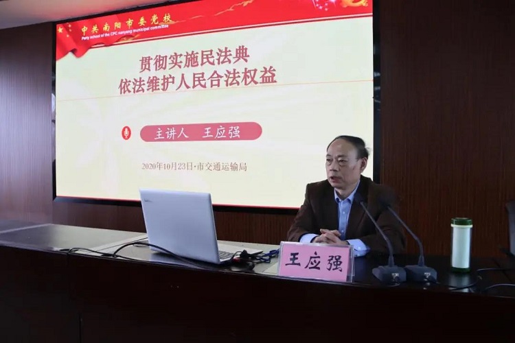 為充分認(rèn)識頒布實(shí)施民法典重大意義,更好依法保障人民合法權(quán)益,10月23日,河南省“百名法學(xué)家百場報(bào)告會”南陽市交通運(yùn)輸局專題報(bào)告會開講。中共南陽市委黨校政法教研室主任王應(yīng)強(qiáng)教授以《切實(shí)貫徹實(shí)施民法典,依法保護(hù)人民合法權(quán)益》為題授課。