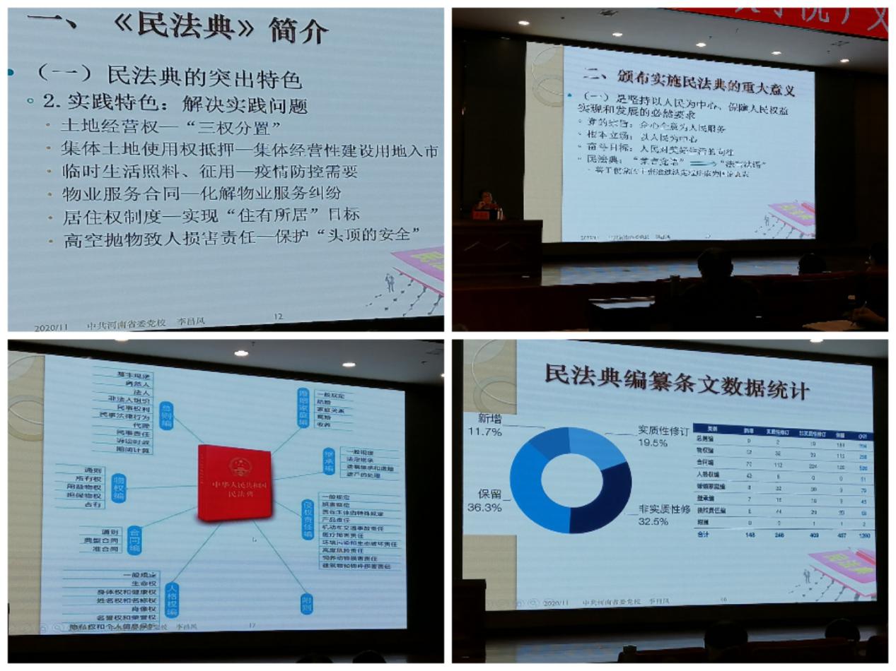 李昌鳳老師以《中華人民共和國民法典解讀》為題,從“民法典簡介”“頒布實施民法典的重大意義”“切實推動民法典實施的新要求”三個方面對民法典體系結構和重要內(nèi)容進行了講解。她結合多年的實際工作經(jīng)驗,引用具體案例對《民法典》中特色、亮點及新增的法律內(nèi)容進行講解,為來自政法及各方面的黨員干部上了一場生動的普法宣講課,使大家進一步對《民法典》有了清晰的認識,有效提升了黨員干部法治水平和依法履職能力,推動了全縣《民法典》的學習宣傳和實施,為智慧光山、法治光山建設提供了有力的法治保障。
