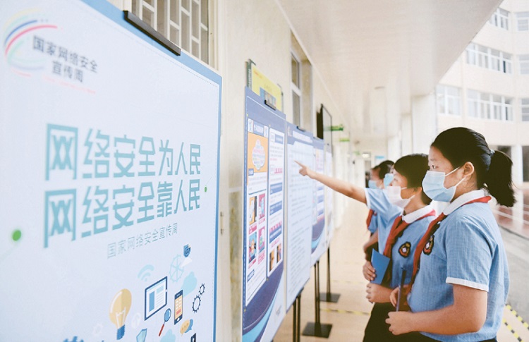 2020年9月14日,河北省石家莊市橋西區(qū)草場(chǎng)街小學(xué)的學(xué)生在觀看網(wǎng)絡(luò)安全知識(shí)展板。 新華社記者 王曉/攝