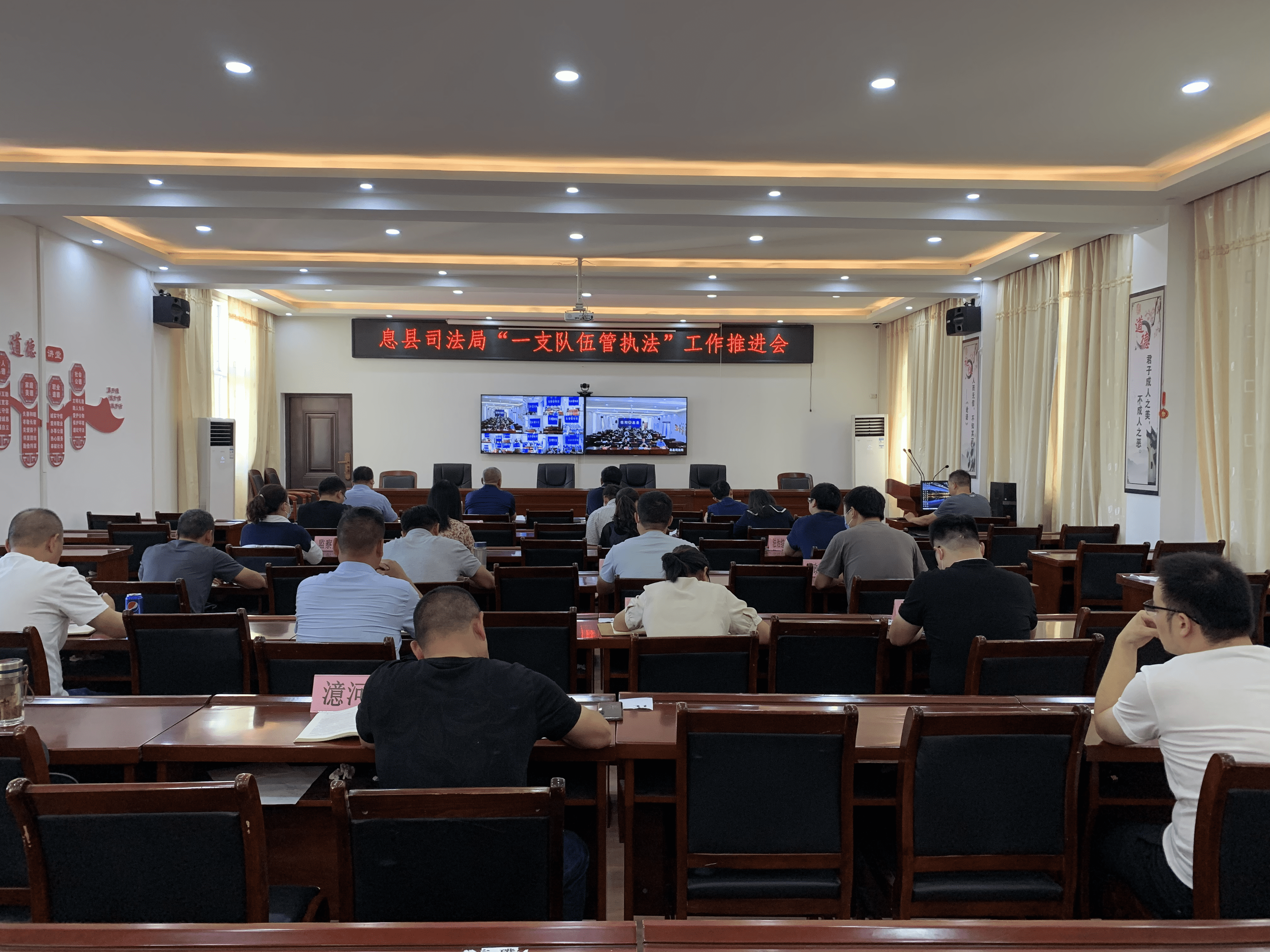 9月5日,息縣司法局召開“一支隊伍管執(zhí)法”工作推進會,局機關(guān)及社區(qū)矯正中心全體人員參會。會議以視頻方式進行,各司法所工作人員在分會場參會。會議由局黨組副書記、副局長吳向峰主持。