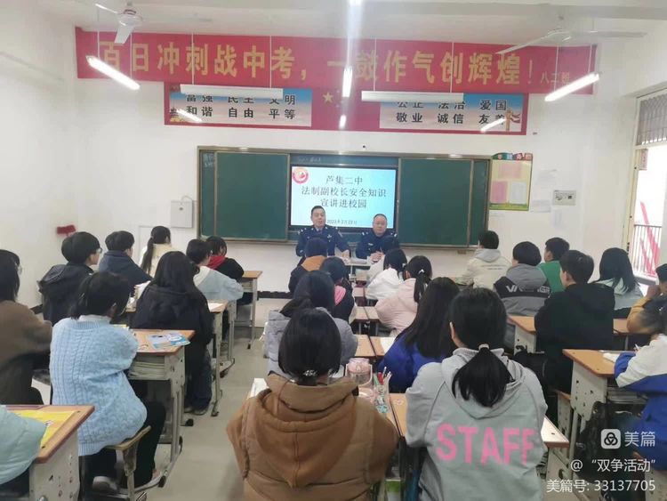 2023年3月22日,蘆集派出所長王恒,指導(dǎo)員程學(xué)眾冒雨深入到蘆集鄉(xiāng)第二中學(xué),給同學(xué)們講法治課。