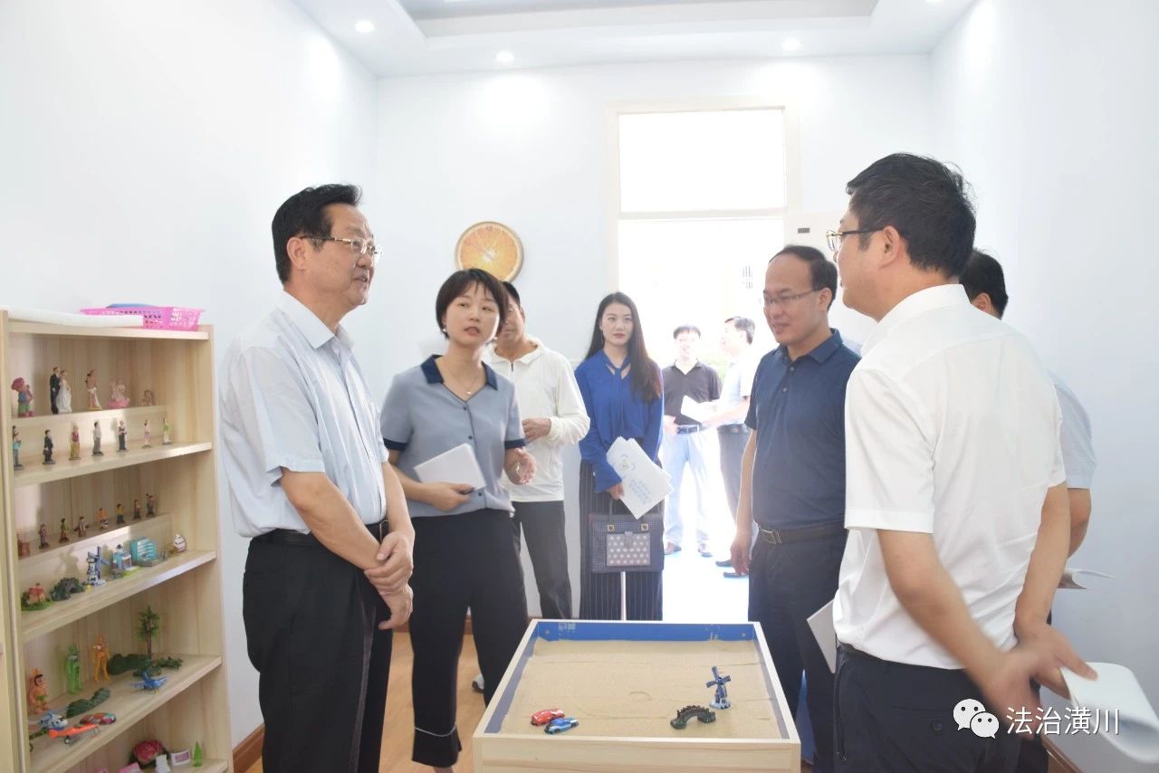隨后,調(diào)研組一行在潢川縣委副書記孔輝、縣委常委、政法委書記陳旭東等同志陪同下,先后深入春申辦事處天駒社區(qū)和第三小學(xué),實地調(diào)研了相關(guān)工作。在天駒社區(qū),詹玉鋒查看了社區(qū)綜治中心基礎(chǔ)設(shè)施建設(shè)和相關(guān)檔案資料,向社區(qū)工作人員詢問了社區(qū)法律服務(wù)站的法律咨詢解答、志愿服務(wù)、矛盾糾紛排查化解等工作情況。在潢川三小,詹玉鋒一行參觀了縣法學(xué)會心理研究會分會心理工作室個體咨詢室、沙盤游戲咨詢室、情緒宣泄室等場所, 詹玉鋒指出要切實關(guān)注未成年人心理問題,用好心理咨詢手段,不斷提升心理咨詢能力水平,面向廣大未成年人開展心理健康知識普及與專業(yè)的心理咨詢服務(wù),幫助未成年人健康成長。