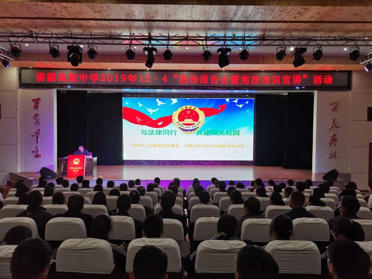 12月4日,是我國第六個國家憲法日。為進一步弘揚法治精神,增強未成年人的憲法意識和法治觀念,濟源市人民檢察院深入濟源高級中學開展法治宣講報告會暨憲法知識競答活動,600余名高一學生聆聽宣講。