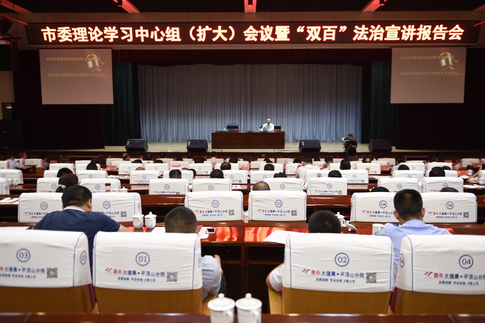 9月13日下午,平頂山市“雙百”法治宣講報告會暨市委理論學(xué)習(xí)中心組(擴大)會議在市行政服務(wù)中心會議室舉行,市委書記胡荃主持會議并講話。在平的市委中心組成員;市委政法委委員;各縣(市、區(qū))、一體化示范區(qū)、高新區(qū)黨政主要領(lǐng)導(dǎo),政法委書記,政府分管法治建設(shè)副職,政法各單位主要負責(zé)人,法學(xué)會常務(wù)副會長、秘書長;市直政法各單位班子成員;市綜治成員單位主要負責(zé)人;新華區(qū)、衛(wèi)東區(qū)、湛河區(qū)法學(xué)會會員共計三百余人參加了會議。