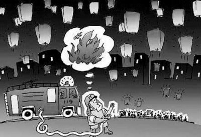 此外,燃放的孔明燈如果遭遇強(qiáng)風(fēng),燈罩被吹斜后可能會被底部的明火引燃,一旦掉落在草堆、樹林、加油站等地,非常容易引發(fā)火災(zāi)。城市上空布有各類供電、照明、通信線路,孔明燈燃放后飛向天空,有可能掛在各種線纜上,造成通信和供電設(shè)施故障。孔明燈可飛到近1000米的高空,一旦遭遇降落或起飛的飛機(jī),將危及飛機(jī)及乘客的安全。在人員密集區(qū)域燃放孔明燈,稍有不慎就會造成人員傷亡。