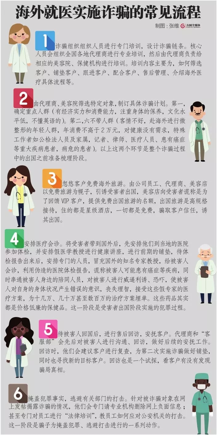第三,忽悠客戶接受免費(fèi)海外就醫(yī)旅游,誘騙其出境,并逐步獲取客戶信任?!拔ㄍ袊H”委托公司員工、代理商、美容店以免費(fèi)旅游為幌子,引誘被害人出國,美容店誘騙被害人的這套“話術(shù)套詞”是:這是總公司為了回饋VIP客戶,特別給出的豪華出國旅游名額,出國旅游都是高規(guī)格接待,住的是星級(jí)酒店,一切都是免費(fèi)的。