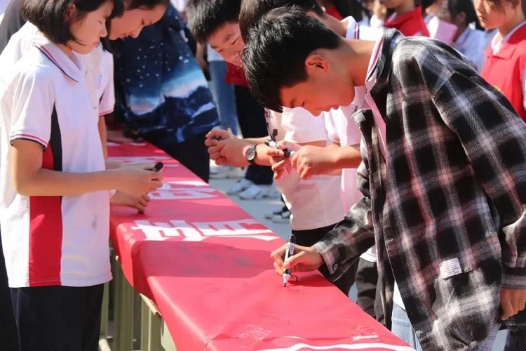 課后,志愿者們向師生發(fā)放了法治宣傳彩頁。同學們在文明上網(wǎng)宣傳橫幅上簽下自己的名字。